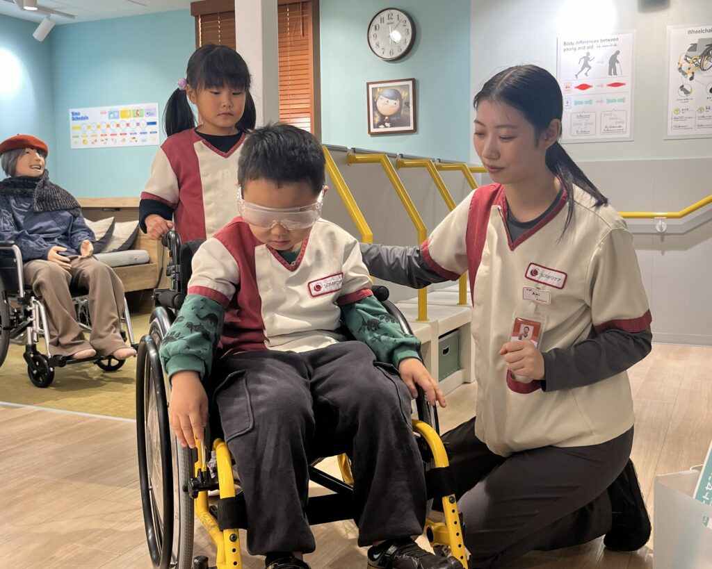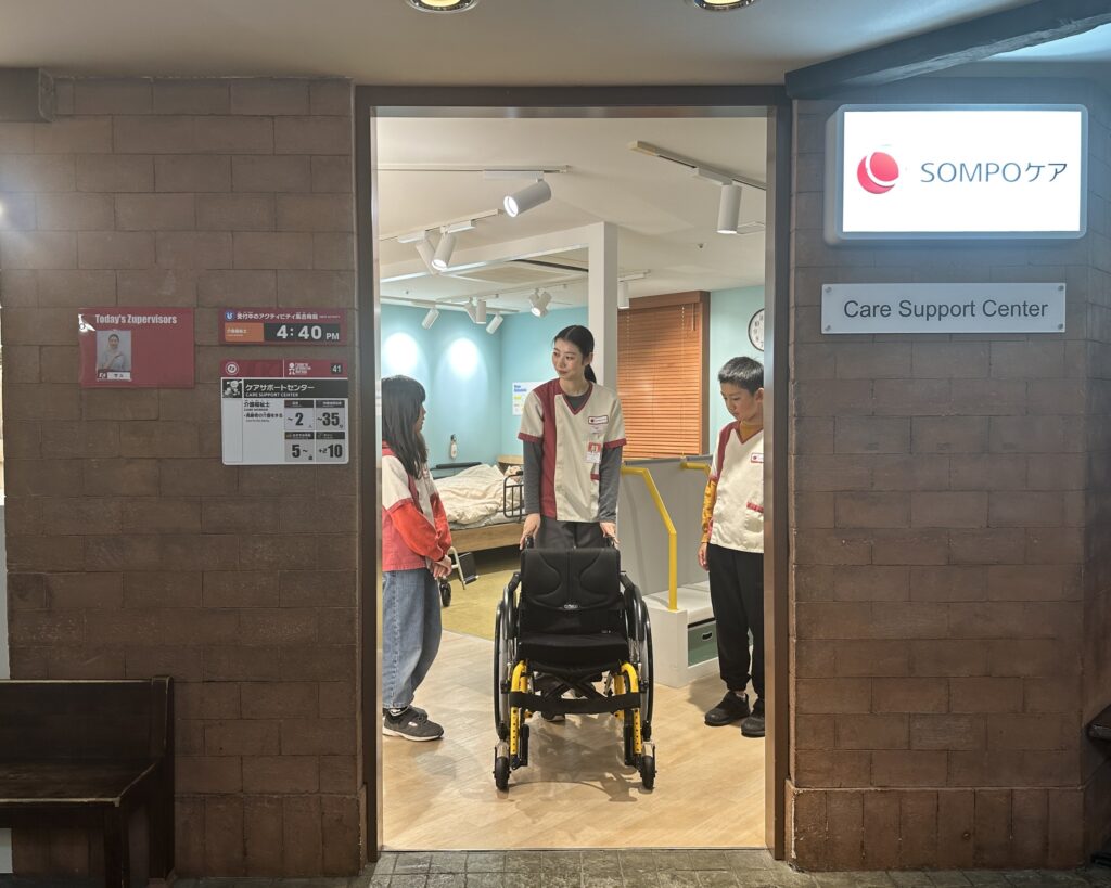 To help children discover the value and meaning of caregiving, Sompo Holdings and group company Sompo Care opened the “Care Support Center” pavilion at KidZania Tokyo in July 2023. Here, children learn to consider the feelings of elderly people and act with kindness, while experiencing the latest ICT-based care technologies. This gives them a glimpse of what the next era of nursing care will look like. Through the pavilion, we hope to show children that helping others, especially the elderly, is something to be proud of, fostering a society that embodies that spirit.
