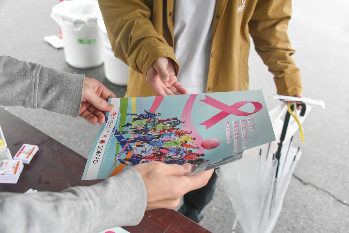 During 30 matches at 27 venues in October 2025, some 15,000 flyers produced by the league and Sompo Japan were distributed to deliver the message of Pink Ribbon Month and of self-examination methods to attendees. Information about the initiative was also shared on social media by the teams and players, broadening the message’s reach beyond match attendees.