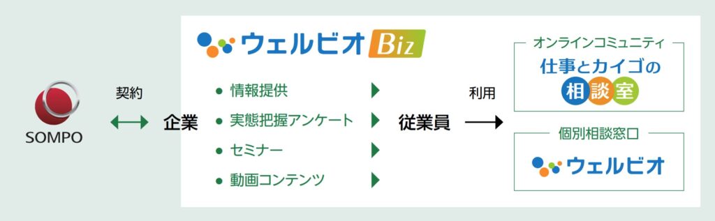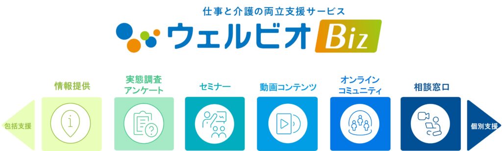 さらに、少子高齢化や共働き世帯の増加なども相まって、近年社会課題となっているのが、従業員の”仕事と介護の両立”。その課題に応えるべく、企業向けの仕事と介護の両立支援サービス「ウェルビオBiz」の展開を開始しました。第一段階として、大企業の皆さまにご利用いただけるサービスとしてスタートしており、安心して働き続けられる環境づくりを後押ししています。