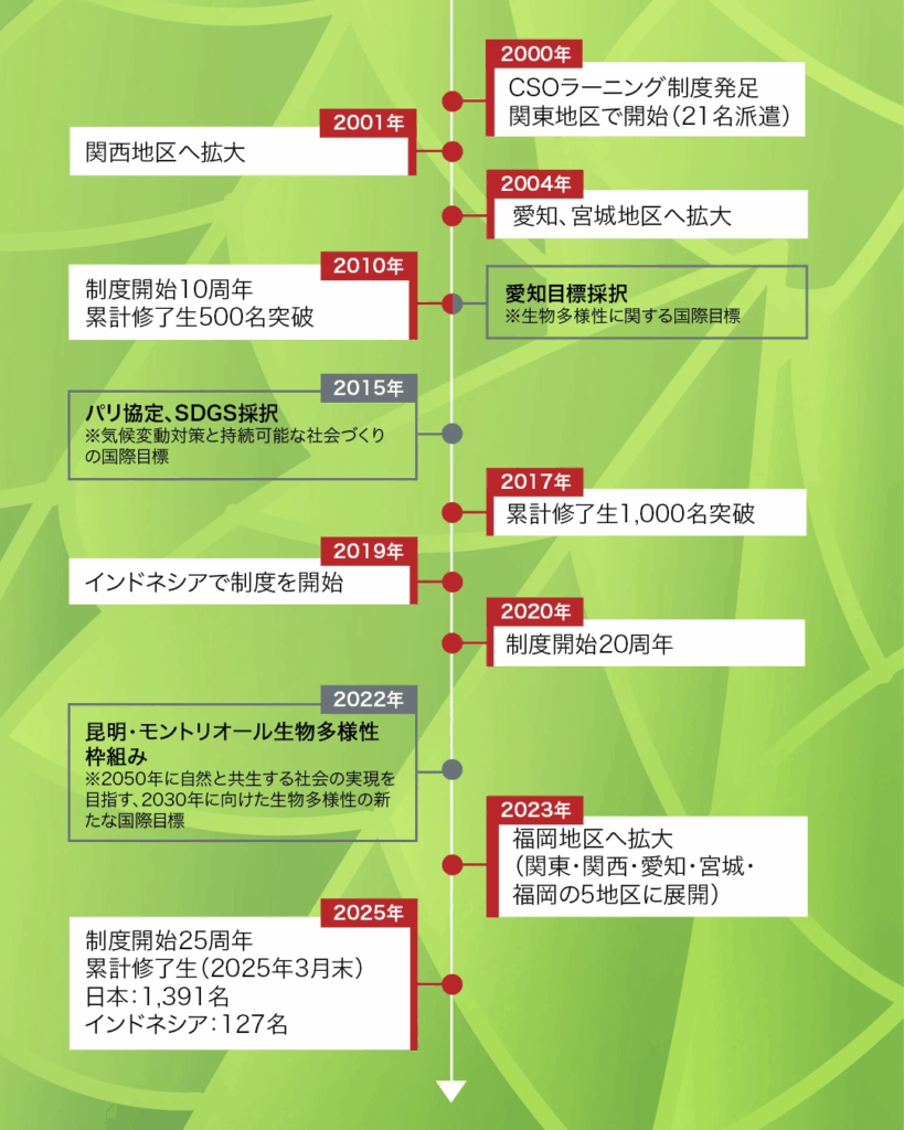 時代が移り変わっても、「木を植える人を育てる」というSOMPO環境財団の理念は揺らぐことはありません。25年の時を経て、CSOラーニング制度は、その意義をさらに深め、進化し続けています。